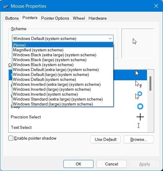 - 在Scheme 下,从 Pointers 选项卡的下拉菜单中选择None。这样做后,关闭窗口,看看这是否能解决问题。