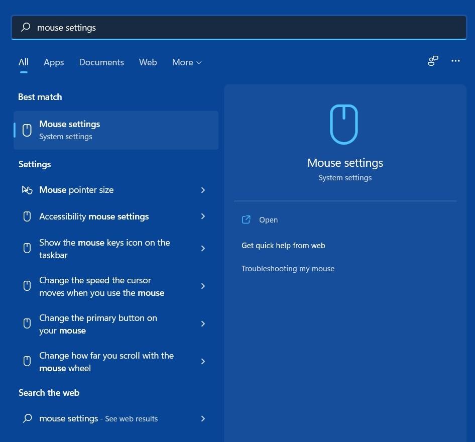 - 在开始菜单中,搜索鼠标设置并按 Enter。