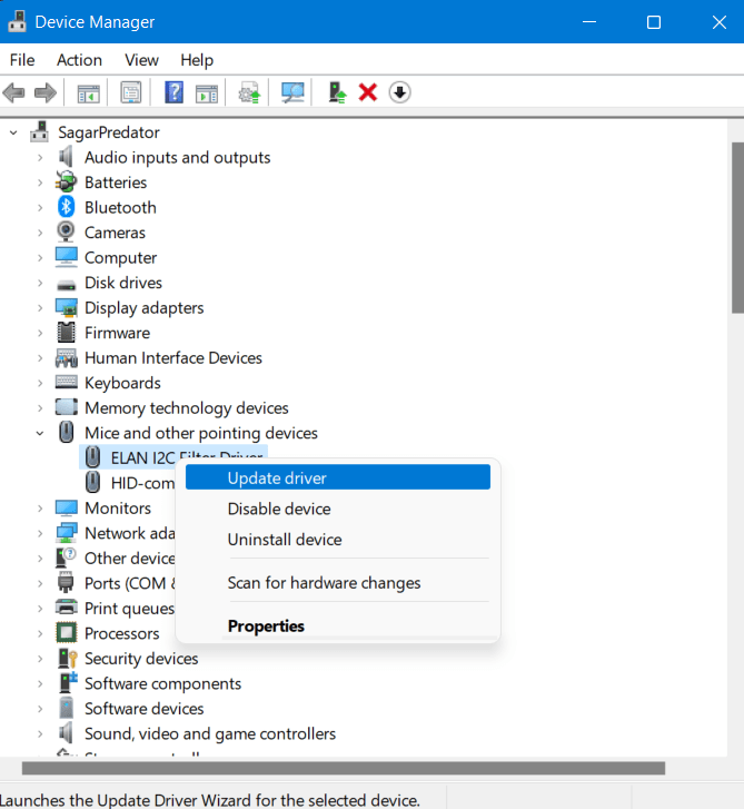 - 右键单击您正在使用的鼠标设备,然后选择更新驱动程序。