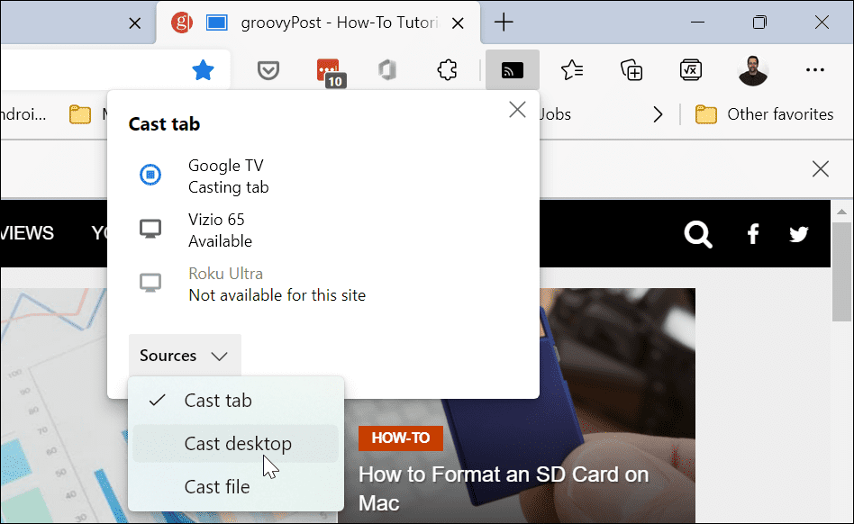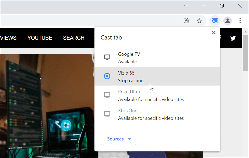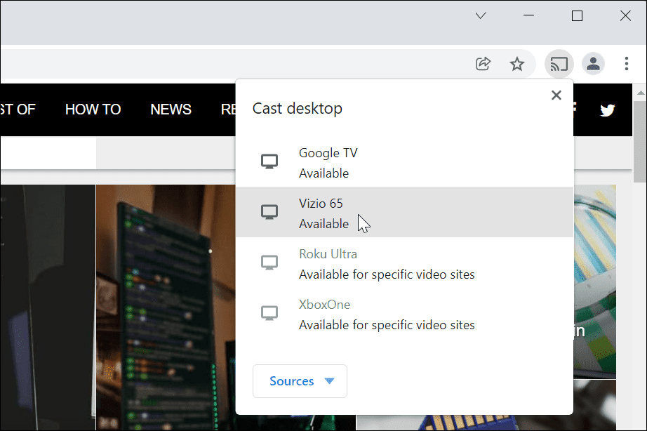 - 在Cast 菜单中,单击Sources下拉菜单,然后选择Cast 桌面选项。
