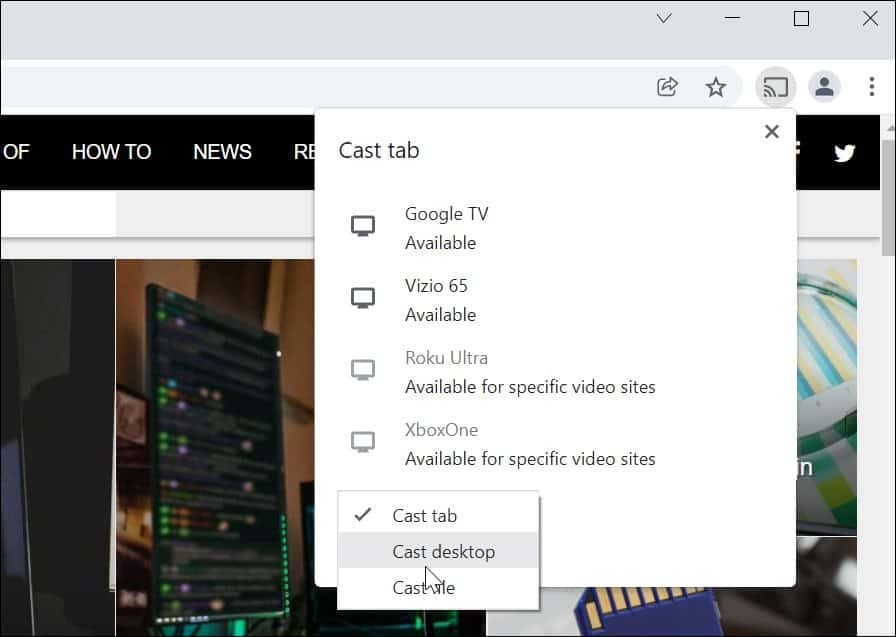 - 从Cast 选项卡下拉列表中,选择您要连接的 Google 设备。您的计算机显示屏将自动出现在您投射到的屏幕上。