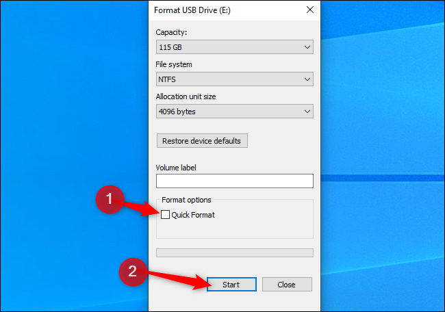 您可以在此处更改您喜欢的任何其他格式选项;只需确保未选中“快速格式化”即可。(如果您不确定该选择什么,只需将此处的选项保留为默认设置即可。)