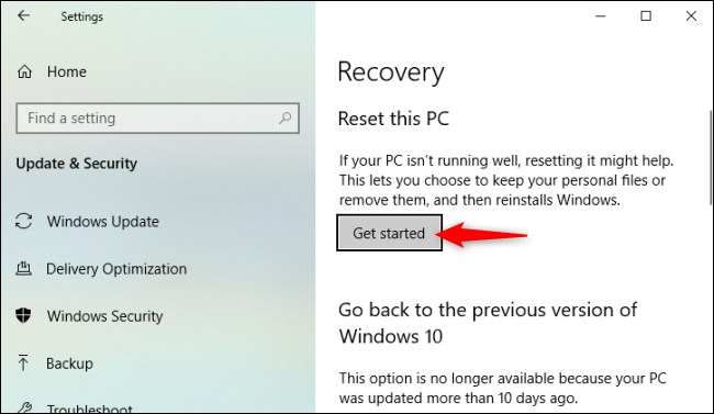 要在 Windows 10 上执行此操作,请前往设置 > 更新和安全 > 恢复。单击重置此 PC 下的“开始使用”。(您可以按 Windows+i 快速打开“设置”应用。)