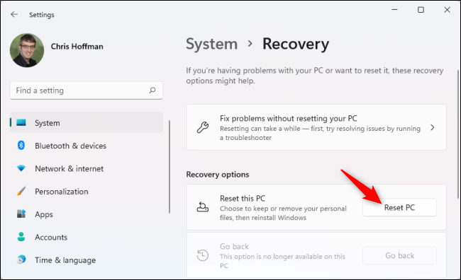 在 Windows 11 上,前往设置 > 系统 > 恢复。单击恢复选项下的“重置电脑”按钮。