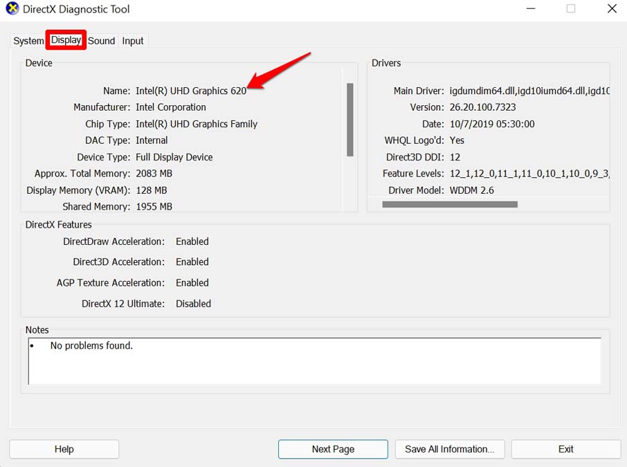 - 您将看到有关计算机上安装的图形单元的完整信息。