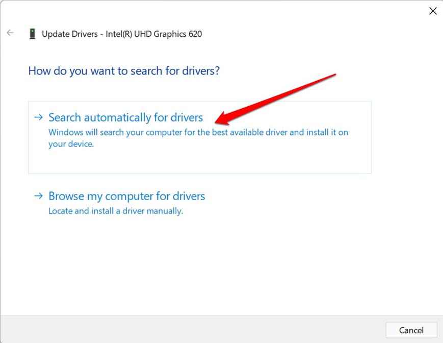 - 当更新驱动程序对话框出现时,单击自动搜索驱动程序。