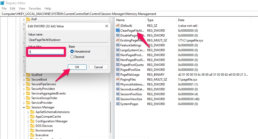 - 将Value Data 设置为 1并单击Ok。