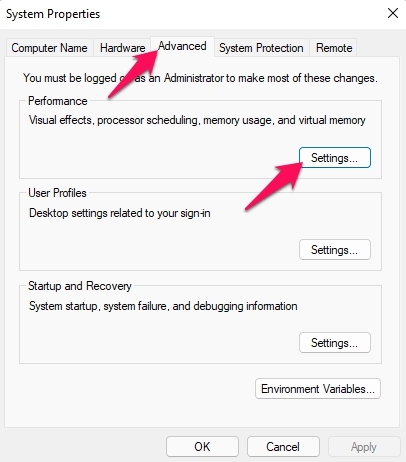 - 导航到“高级”部分,然后单击“性能”下的“设置”。