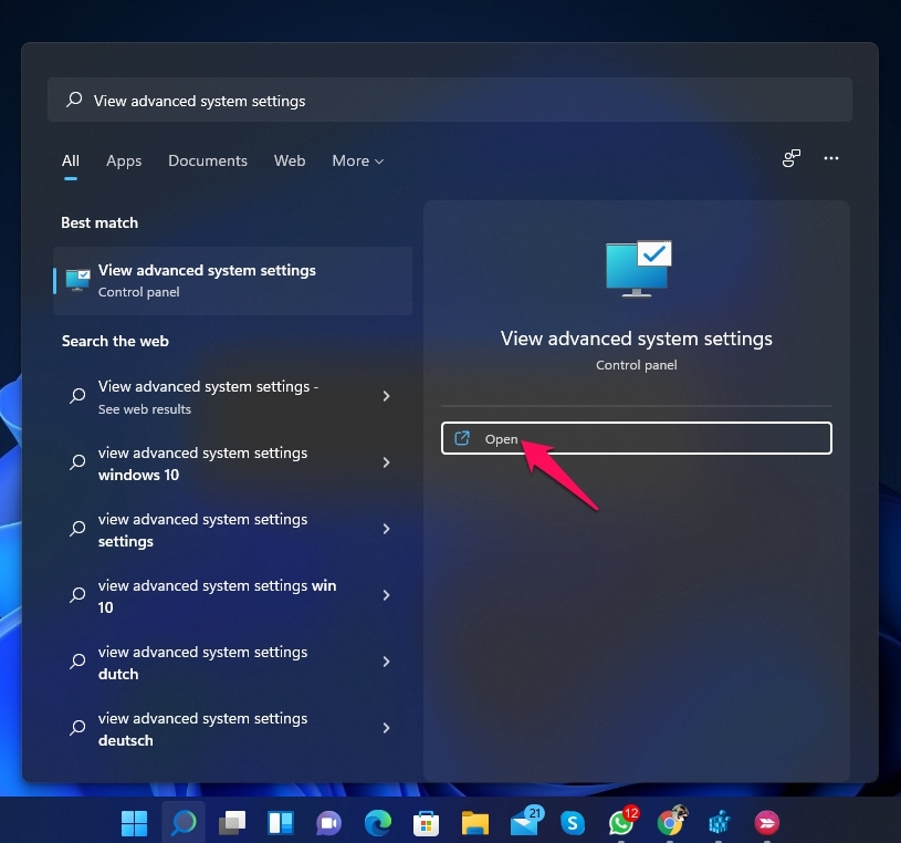 - 单击开始并搜索查看高级系统设置。