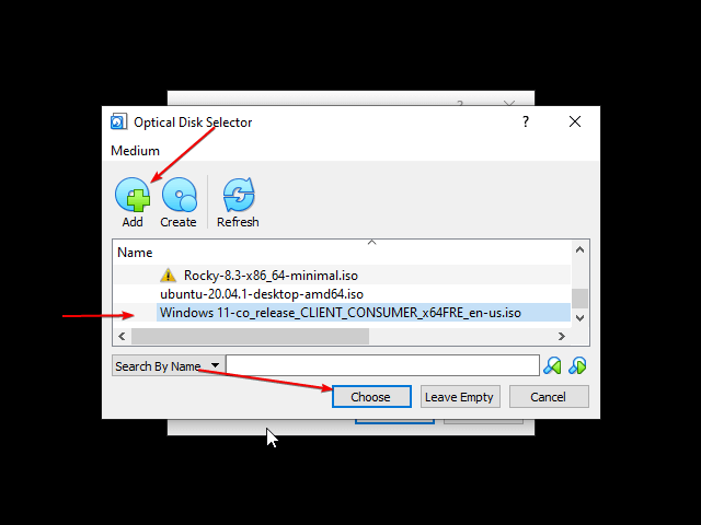 单击添加按钮,这将在您的系统上打开文件管理器。选择您下载的Windows 11 ISO 文件,然后从光盘选择器文件选择区域再次选择它。最后,单击“选择”按钮。