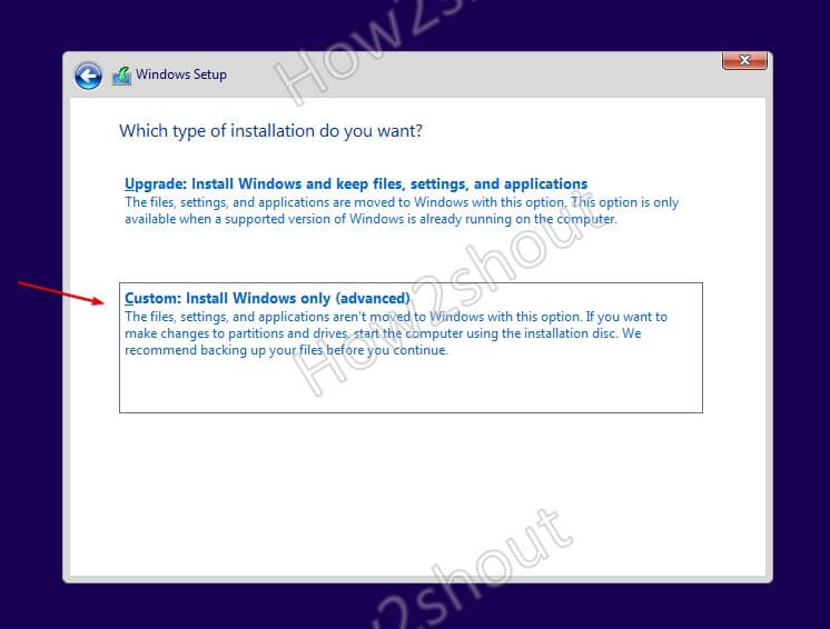选择 – 自定义:仅安装 Windows(高级)选项。