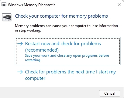 - 按 Enter 后,将打开Windows内存诊断弹出窗口。将有两个选项: