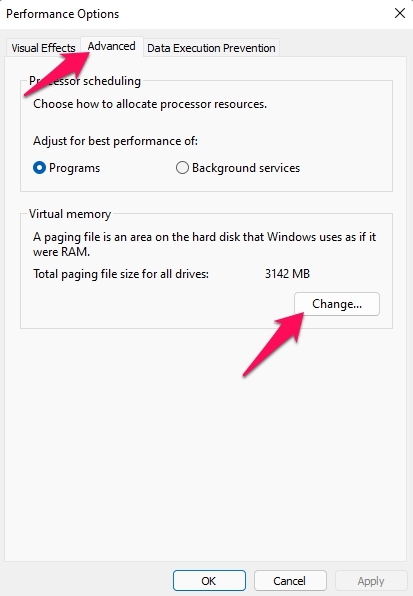 - 将出现性能选项窗口。导航到高级选项卡,然后单击更改。