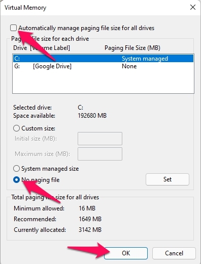 - 取消选中自动管理所有驱动器的分页文件大小选项,选择列表中的每个驱动器,然后单击无分页文件选项。