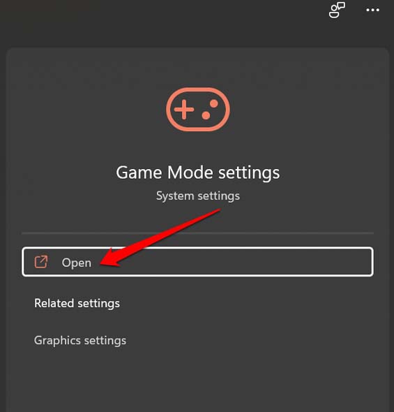 - 输入游戏模式设置并在出现正确的搜索结果时单击打开。