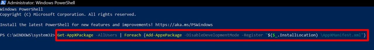 获取-AppXPackage -AllUsers | Foreach {Add-AppxPackage -DisableDevelopmentMode -Register “$($_.InstallLocation) \AppXManifest.xml”}
