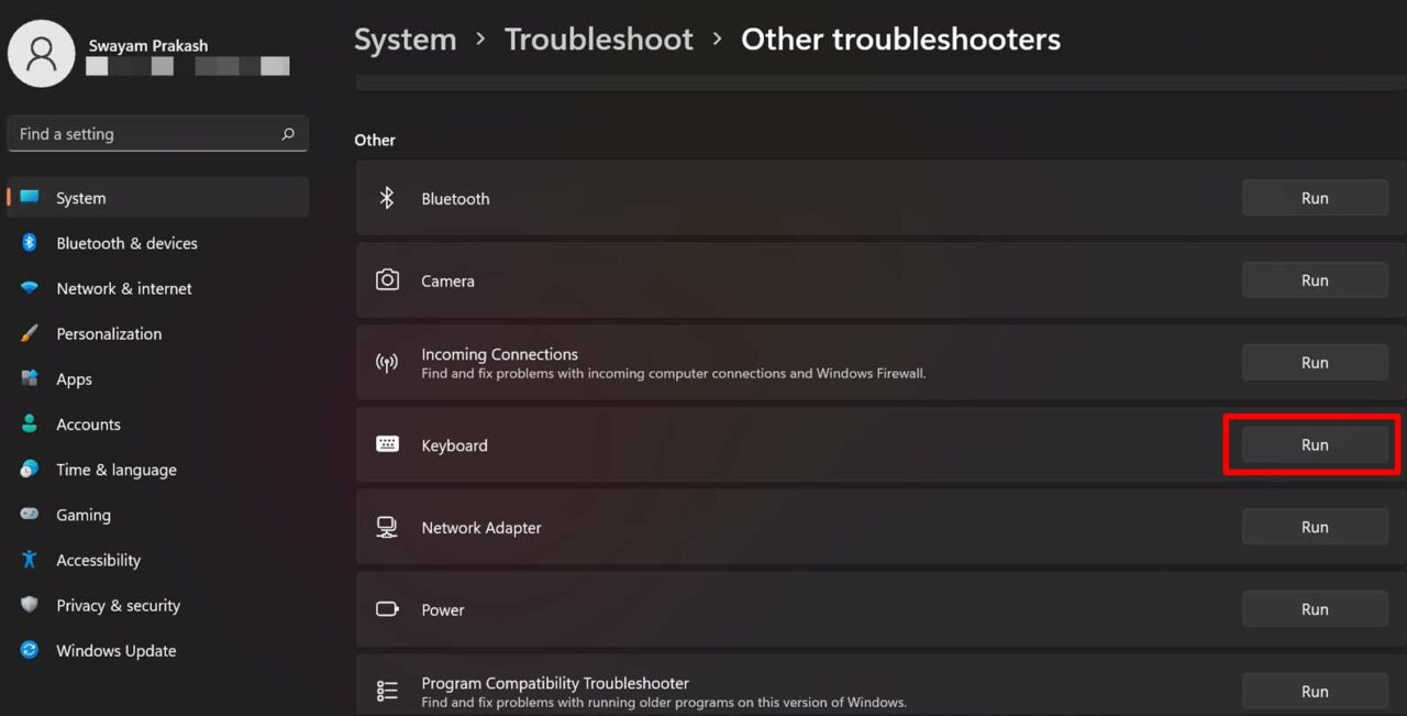 这是一个内置工具,即 Windows 11 中提供的 Windows 键盘疑难解答程序,它有助于修复键盘上的技术问题。这是您可以使用它的方法。