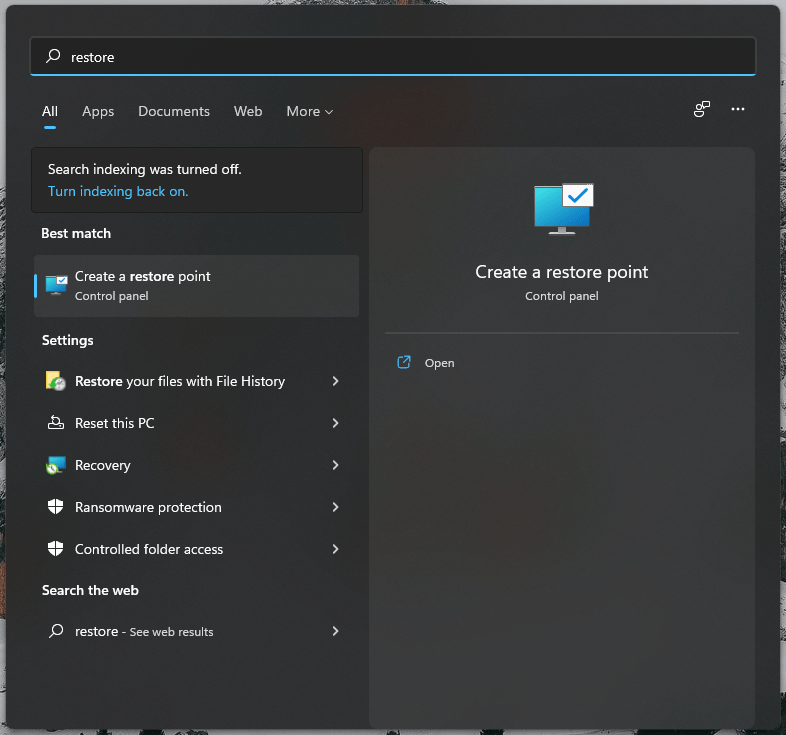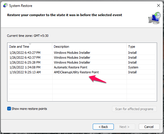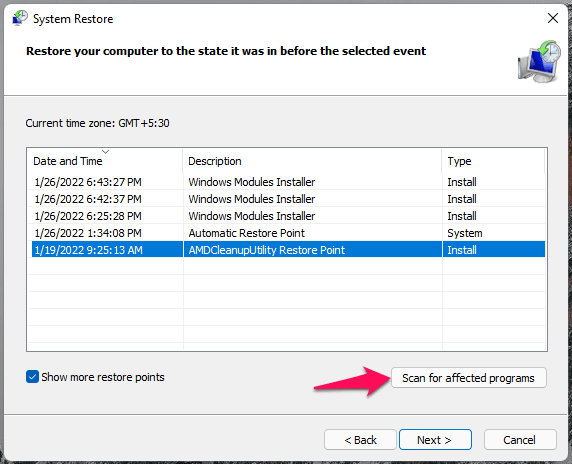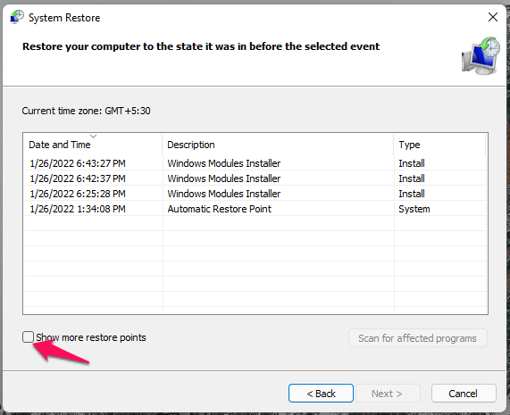 默认情况下,Windows 会自动执行还原点,但该功能在某些机器中被禁用。我建议用户尝试另一个还原点或选择更接近所选点的还原点。请允许我向您展示如何在 Windows 11 或更早版本中找到系统还原中的隐藏选项。