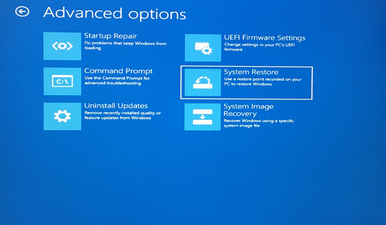 您可以再次尝试系统还原并选择其他还原点。如果您继续看到此错误,您可以尝试高级恢复方法。”