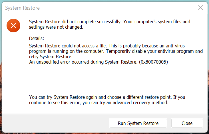 我们必须考虑几点然后得出结论,这将有助于用户在遥远的将来防止错误。我们依赖系统还原,并希望该功能在软件出现问题时拯救我们。我提供了为什么 0x80070005 出现在您的屏幕上的正当理由。