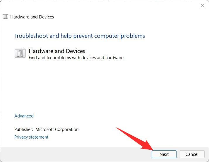 - 在打开的新窗口中,只需按下一步按钮。这样做将在您的 PC 上运行疑难解答。它不仅会检测您的硬件和设备的任何问题,还会在此过程中修复它们。