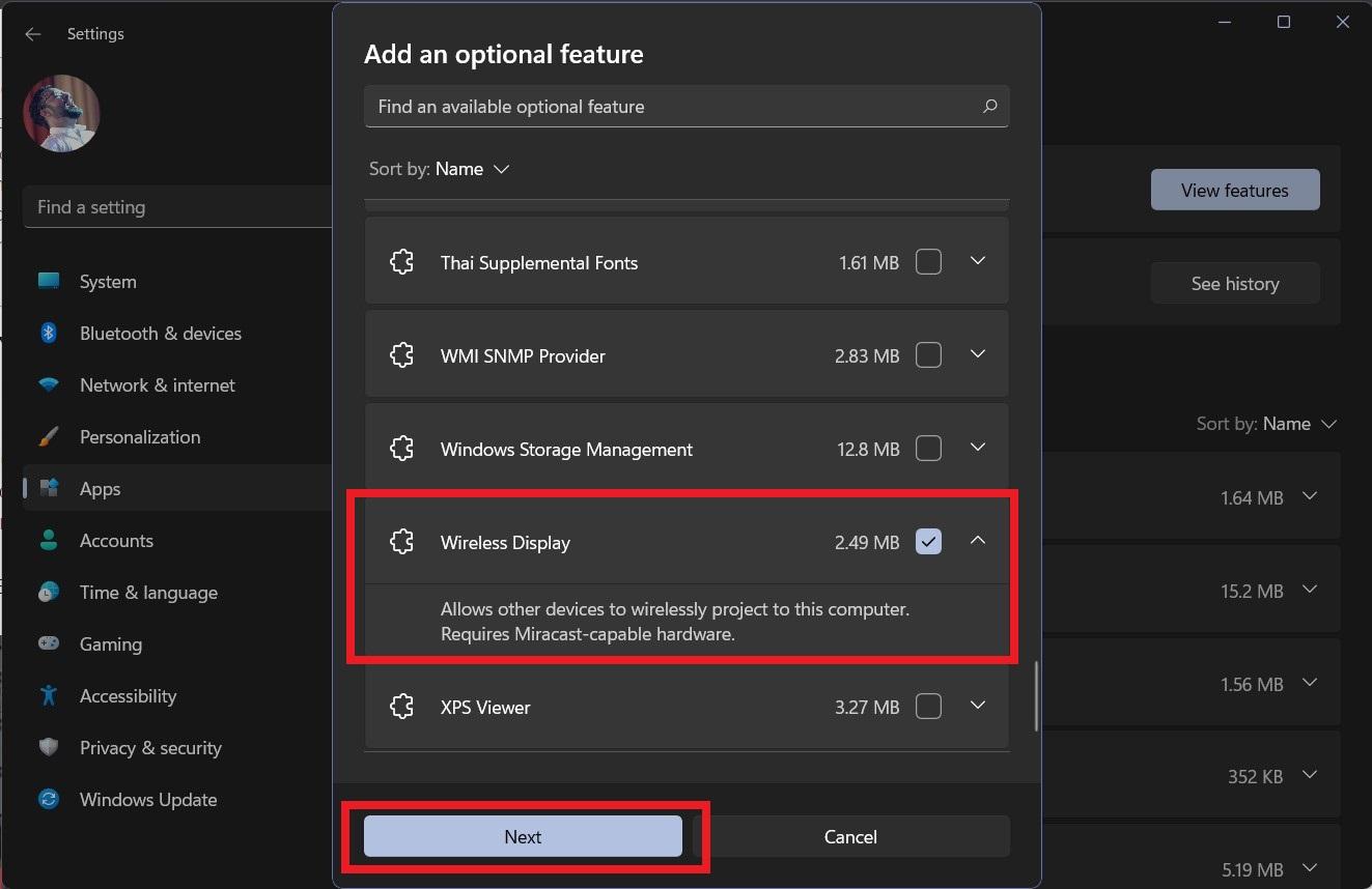 - 您可以搜索无线显示或向下滚动并选择 无线显示 功能。选中它旁边的框,然后单击 Next。然后,单击 下一页上的安装,让该功能安装在您的 PC 上。