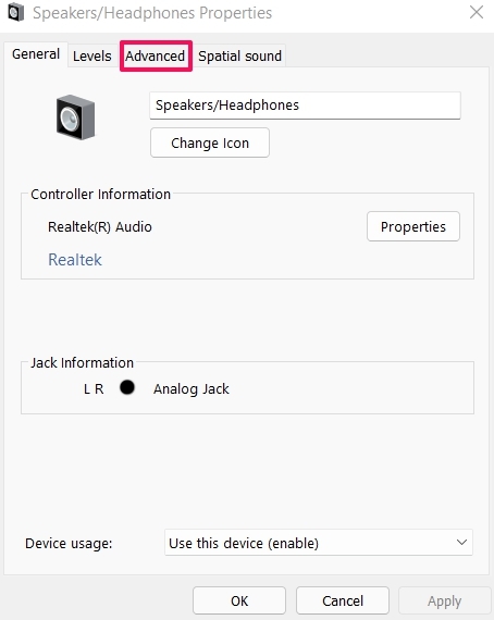 - 在扬声器/耳机属性窗口中,单击高级选项。