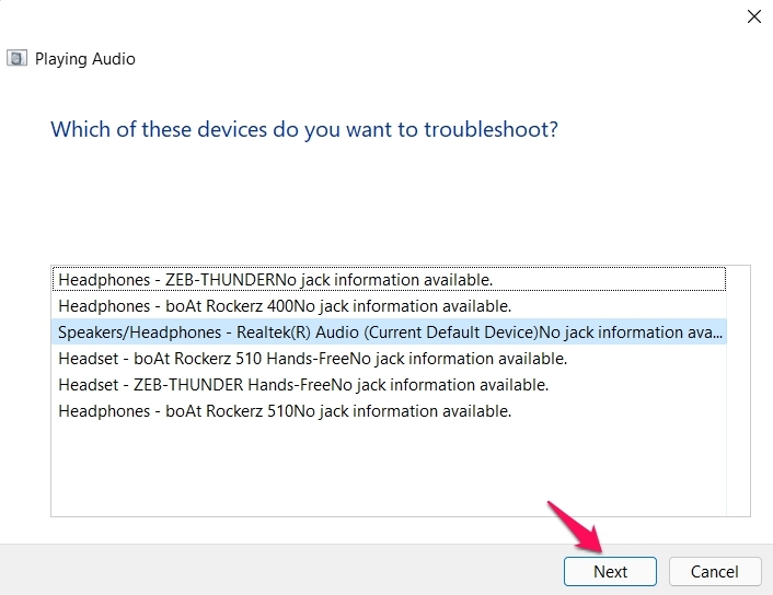 - 选择您要排除故障的音频设备,然后单击下一步。