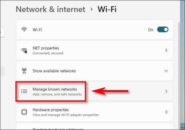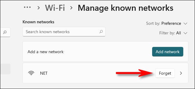 您还可以在Windows 11 设置应用程序中忘记保存的 Wi-Fi 网络。即使您目前不在 Wi-Fi 网络范围内,这也会让您忘记它。