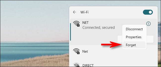 Windows 11 将忘记 Wi-Fi 网络,清除该特定接入点的存储设置。如果它以前是默认的 Wi-Fi 接入点,您的 PC 将不再尝试自动连接到它。