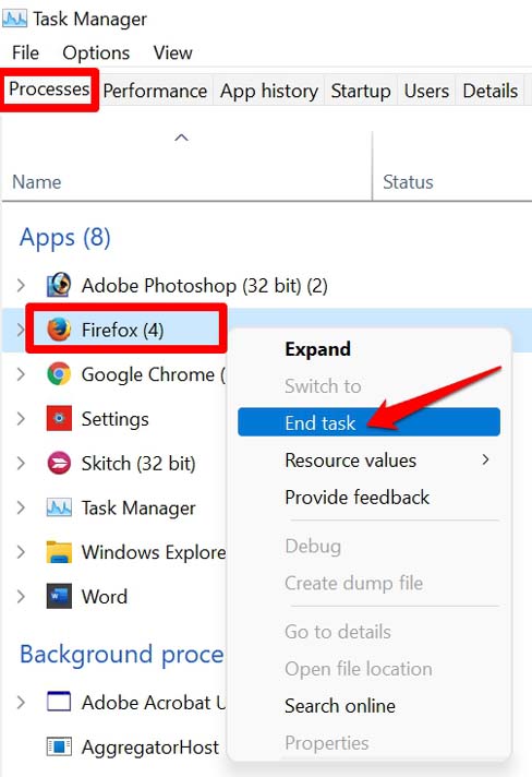- 导航到进程选项卡下的 Mozilla Firefox。