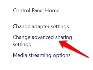 - 在此之下,单击左侧面板上的更改高级共享设置选项。