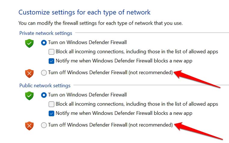 - 为专用网络设置和公共网络设置选择关闭 Windows Defender 防火墙选项。