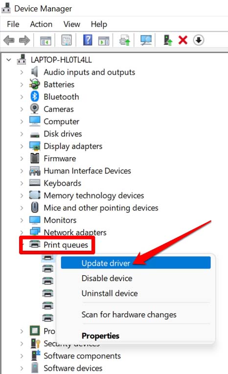 - 选择您的打印机并右键单击它并选择更新驱动程序。