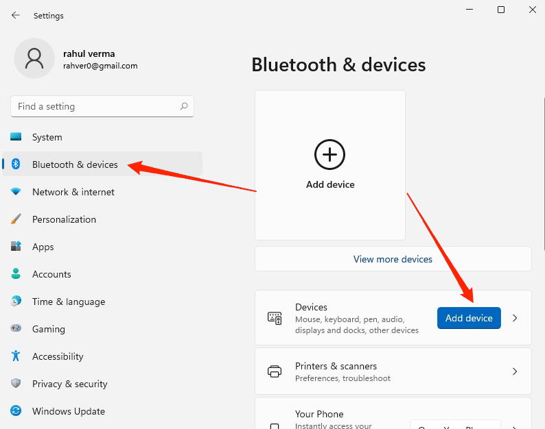 - 打开 Windows 11 设置 (Windows+I) 并导航到 蓝牙和设备 选项。在这里单击 添加设备 选项。