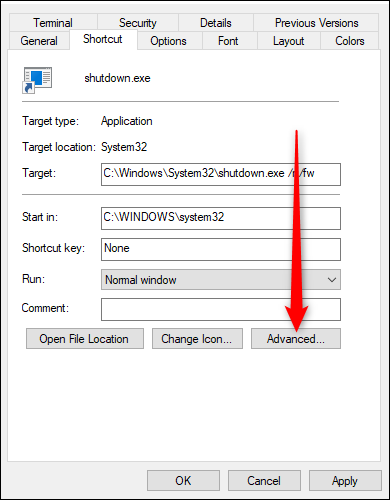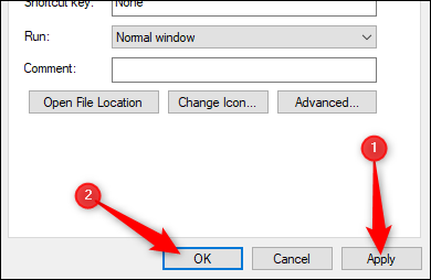 返回“属性”窗口,单击“应用”,然后单击“确定”以完成创建快捷方式。
