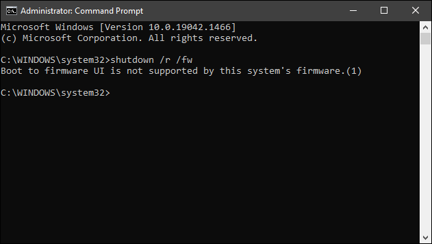 如果您在尝试运行关机命令时看到消息“此系统的固件不支持引导至固件 UI”,这可能意味着您的主板没有 UEFI。这也可能意味着 Windows 10 安装在使用 MBR 分区的磁盘上。