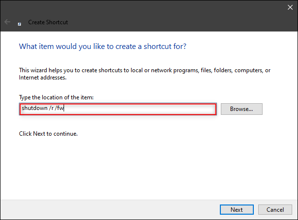 在出现的窗口中,输入shutdown /r /fw要输入项目位置的位置,然后点击下一步。将快捷方式命名为适当的名称,然后单击“完成”。