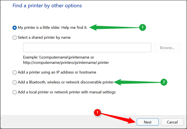 选择“我的打印机有点旧。帮我找找。” 如果您将打印机插入计算机。如果是网络或其他无线打印机,请选择“添加蓝牙、无线或网络可发现打印机”。