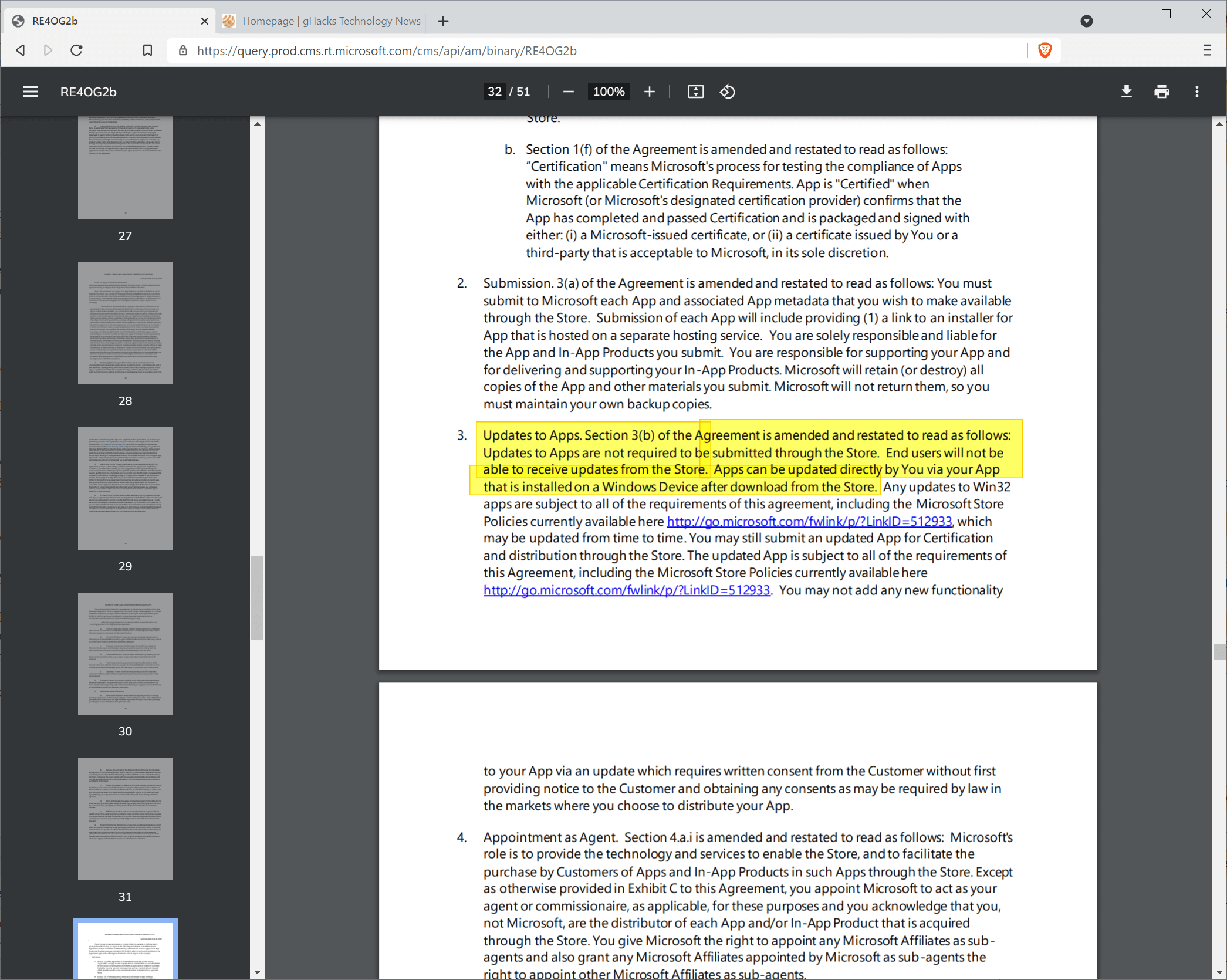 Win32 应用程序的特殊要求列在协议第 32 页的附件 E:WIN32 应用程序包的条款和条件下。对于 Win32 应用程序的更新,Microsoft 描述了以下要求:
