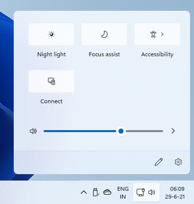 单击托盘中的系统图标之一会出现快速切换。圆角在这里也很明显,我不得不承认,它使操作系统比 Windows 10 更好看。
