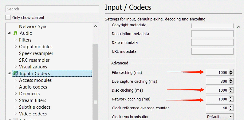 - 在这里单击输入/编解码器选项。将文件缓存 (ms) 的值更改为更高的值,例如 1000 或 2000。对网络缓存 (ms) 和磁盘缓存 (ms) 也执行相同操作。