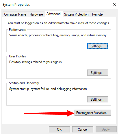 要配置环境变量,请单击“开始”按钮,然后在搜索栏中键入“环境属性”并按 Enter。在“系统属性”窗口中,单击“环境变量”。