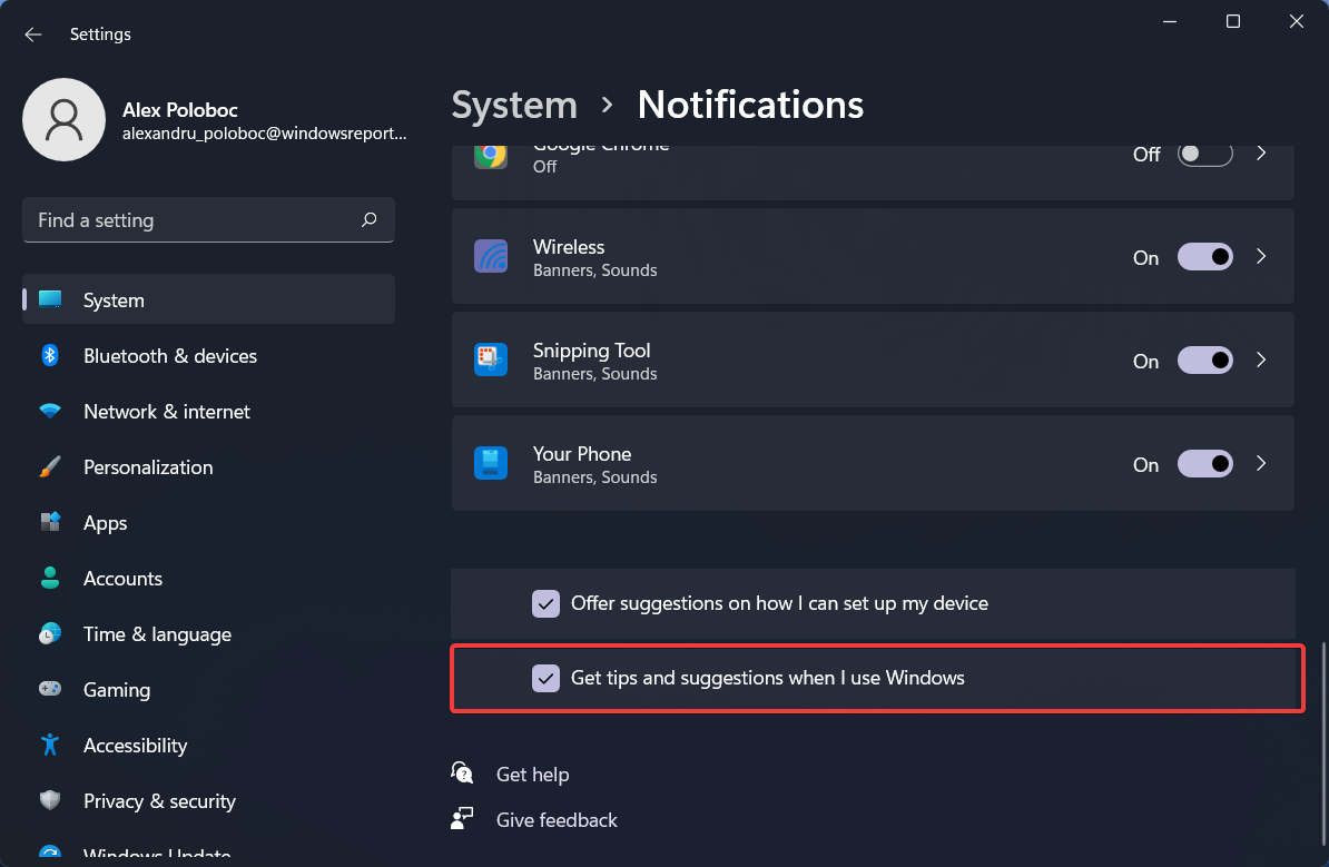 - 取消选中使用 Windows 时获取提示和建议旁边的框。