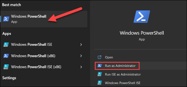 为此,请打开“开始”菜单并搜索“PowerShell”。单击“以管理员身份运行”选项或右键单击列表中的“Windows PowerShell”并选择“以管理员身份运行”。