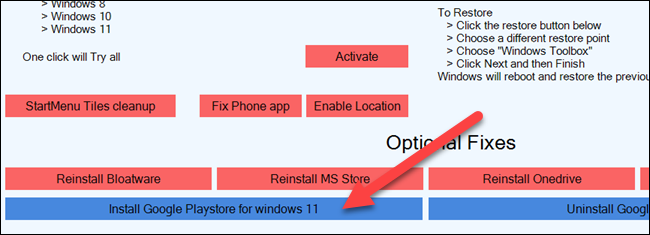“Windows 工具箱”窗口将打开。我们需要做的就是单击“安装适用于 Windows 11 的 Google Play 商店”。如果看不到,请向下滚动。
