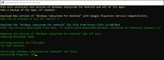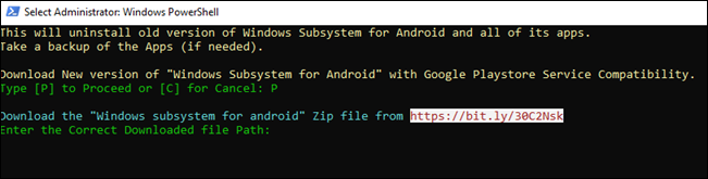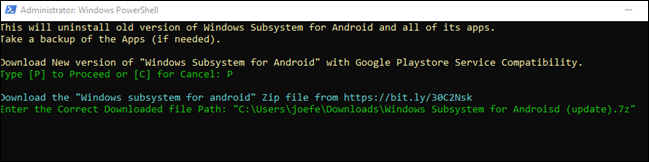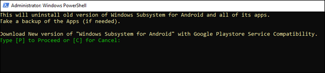 现在,适用于 Android 的 Windows 子系统将被新的软件包取代。输入“P”继续。