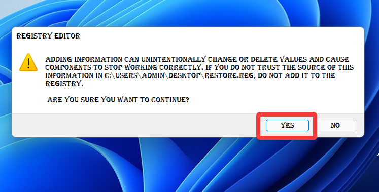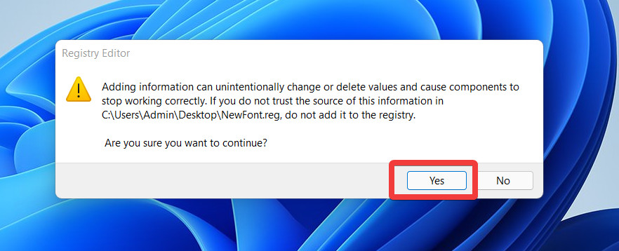 现在单击“是”,一旦提示将条目合并到您当前的注册表。合并后重新启动系统,现在应在 Windows 11 中恢复默认字体。