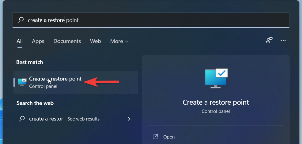 点击 Windows 键并在搜索栏中键入创建还原点。单击并从搜索结果中打开相同的内容。