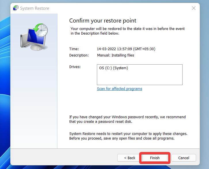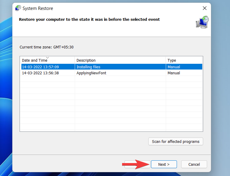 现在,耐心等待,直到系统回滚到上一个还原点。完成后,应在系统上恢复默认的 Windows 11 字体。